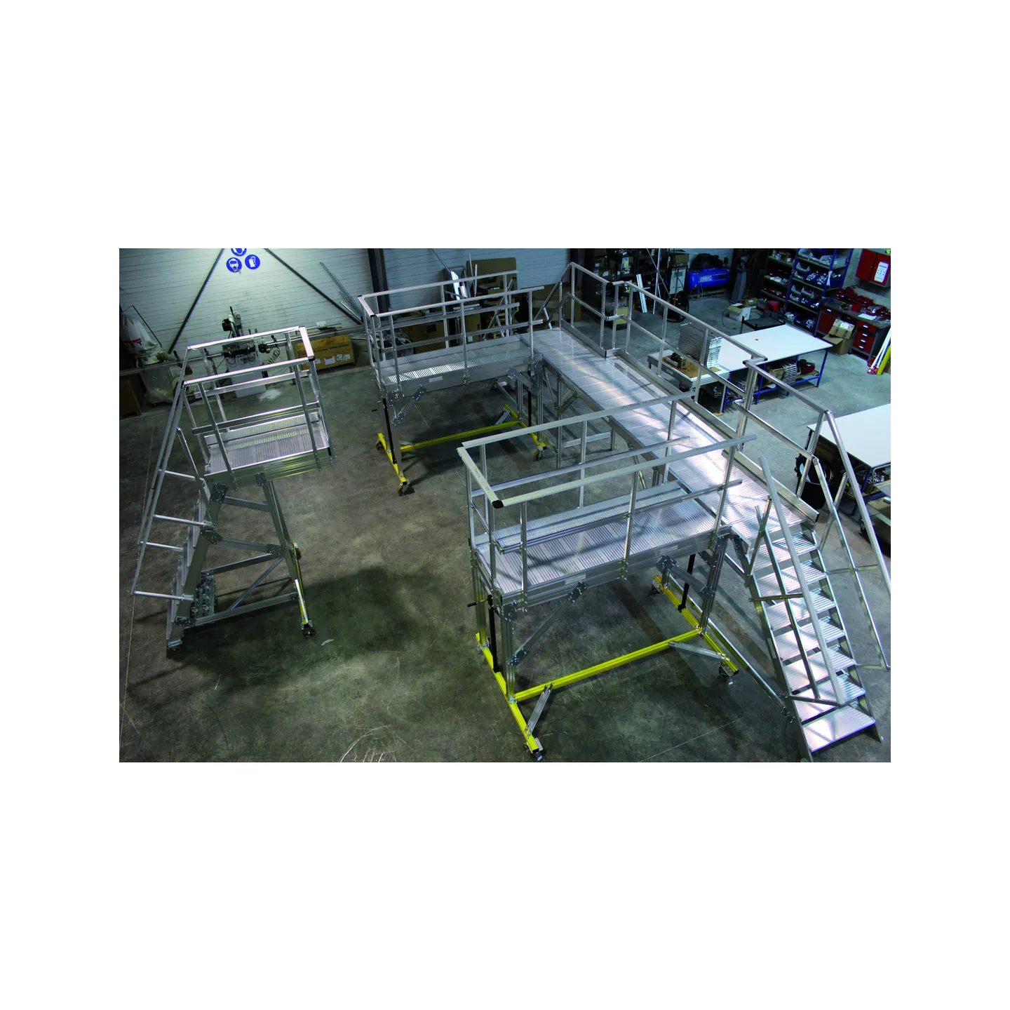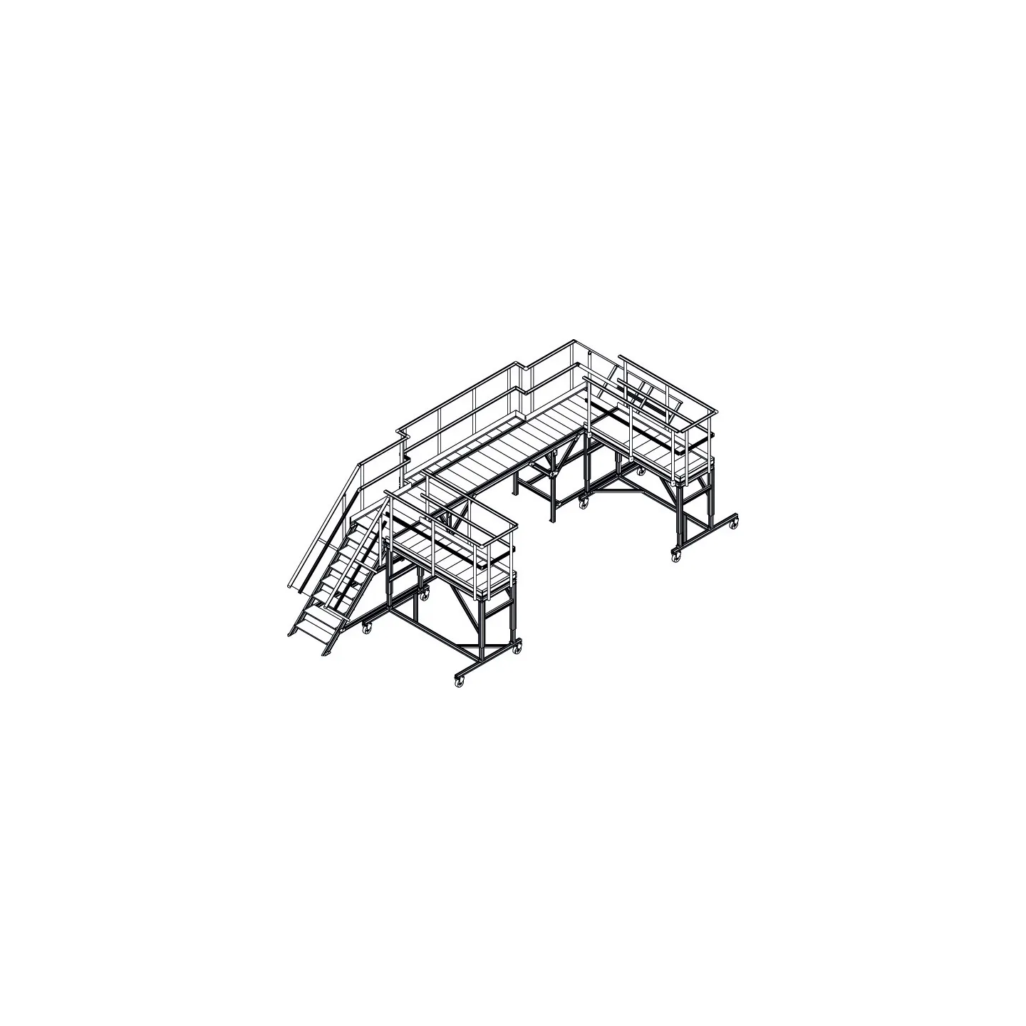 Proyecto compuesto por 2 pasarelas ajustables en altura manualmente, una pasarela con acceso y una plataforma móvil con voladizo