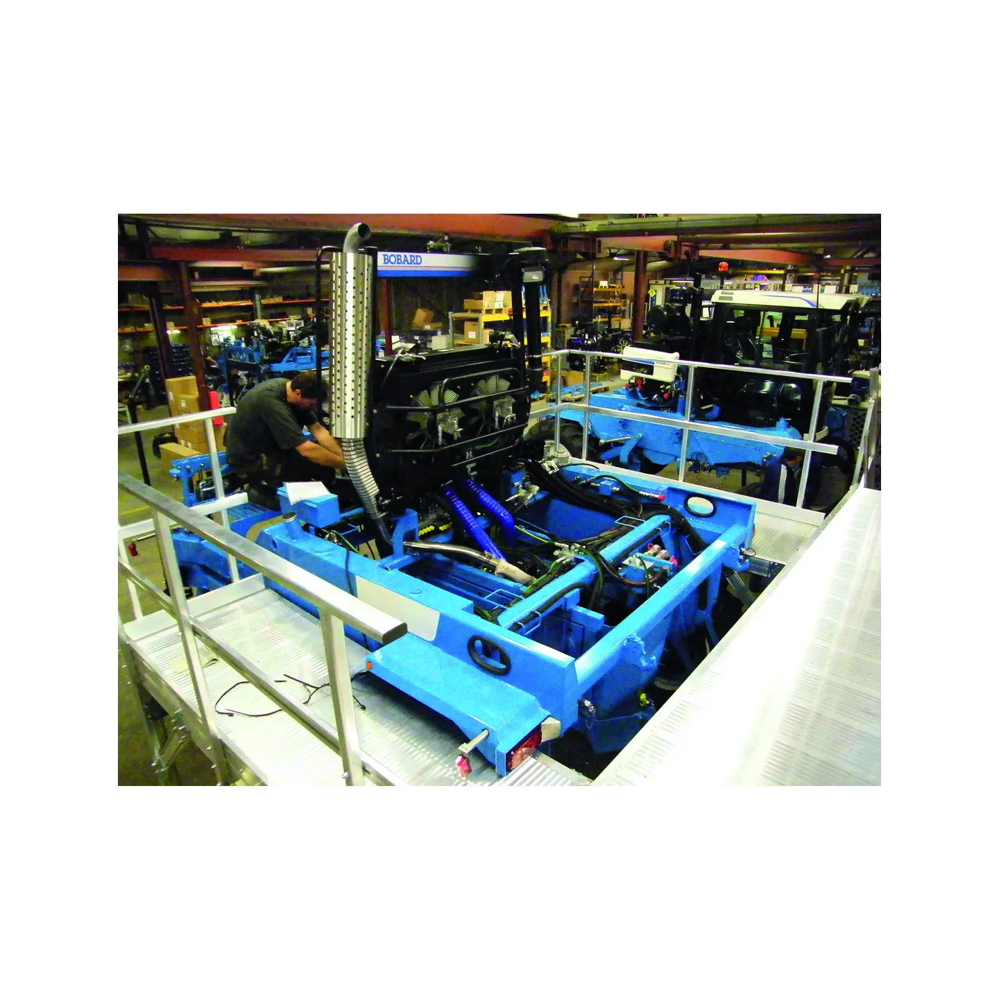 El puesto de trabajo rodea la máquina por tres de sus cuatro lados gracias a pasarelas móviles con un sistema mecánico de unión entre ellas
