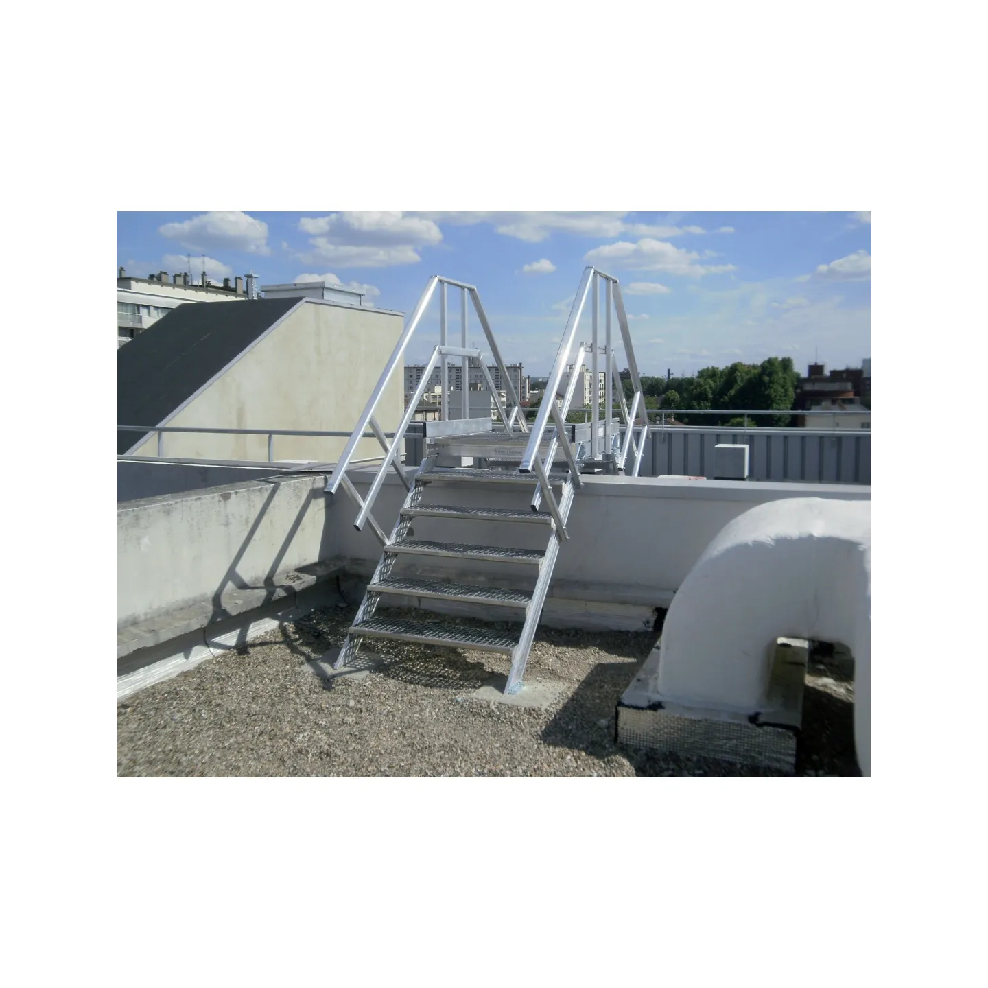 Pasarela de doble acceso con colocación entre cubiertas. Fijación sobre losa de hormigón para preservar la estanqueidad de la cubierta.