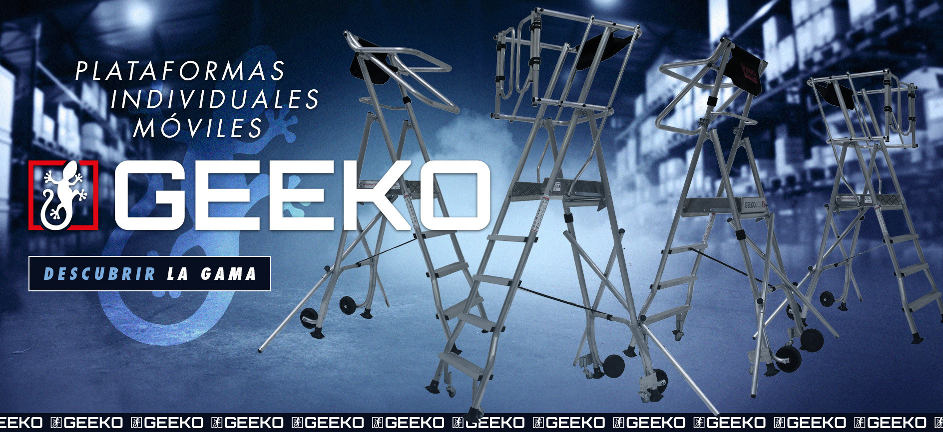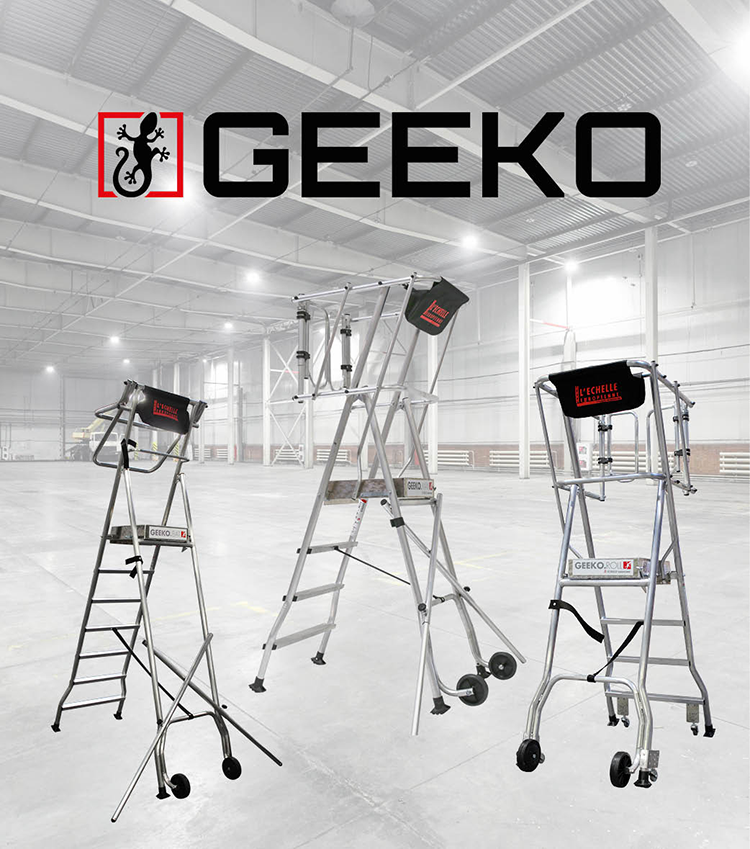 - GEEKO.BAT: Esta plataforma cuenta con barandillas automáticas que aseguran una seguridad óptima para el usuario. Sus ruedas grandes de 180 mm facilitan el desplazamiento sobre todo tipo de superficies, haciendo que los trabajos en interiores y exteriores sean más prácticos.
