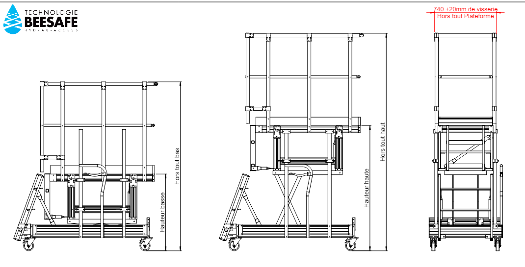 Gracias a un sistema de regulación manual de la altura con una precisión milimétrica, las plataformas Beesafe permiten acceder fácilmente a diferentes alturas de trabajo, sin necesidad de un CACES (certificado de aptitud para la conducción segura). Este ajuste es posible gracias al uso de un gato hidráulico, lo que elimina la necesidad de electricidad y simplifica el mantenimiento.