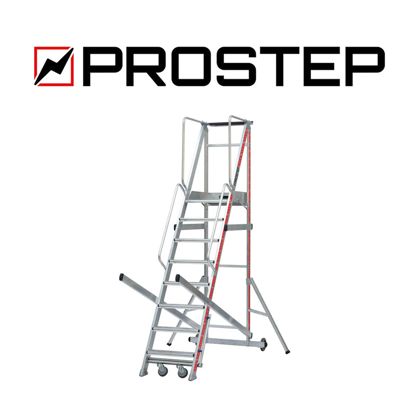 Plataforma de trabajo segura PROSTEP diseñada para la preparación de pedidos y el acceso a zonas de almacenamiento y estanterías. Disponible con 5 a 12 peldaños para todo tipo de estanterías de 3,10 a 4,50 m de altura de trabajo.