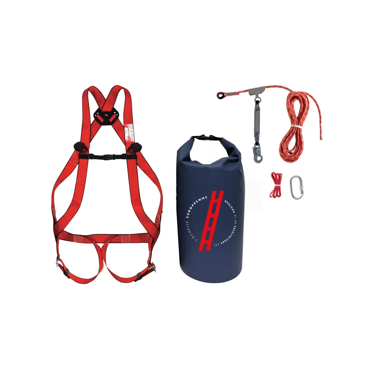Arnés SECUREE con 2 puntos de anclaje. Anti-caída de corredera sobre cuerda de diámetro 12 mm de 10 m con "prolongación absorbedor" y mosquetón de doble lengüeta en acero abertura 22 mm. Mosquetón estándar en acero abertura 18 mm. Ancaje temporal de cinta longitud 80 cm. Suministrado con manula de instrucciones. Conforme a las normas en vigor