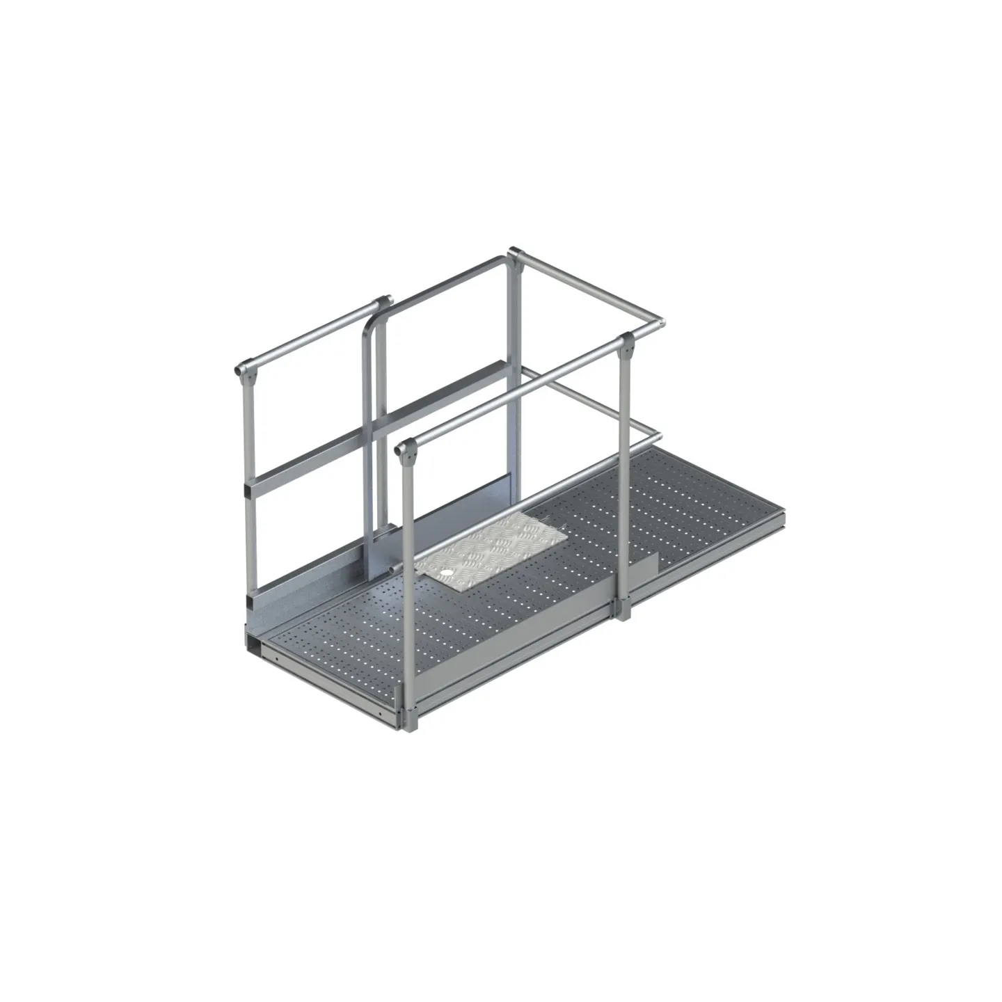 Plataforma robusta en chapa de aluminio lagrimada con seguridad colectiva por guarda-cuerpos y portillón corredero