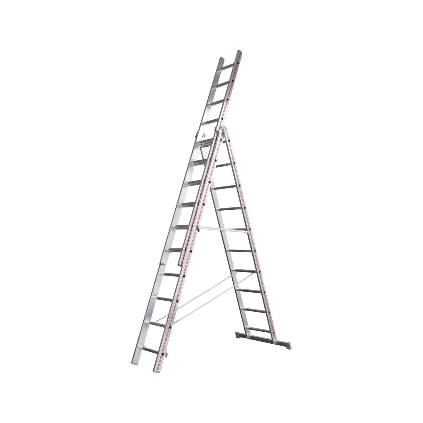 Contrairement à une échelle simple, l’échelle 3 plans est multi-fonctions. Elle peut en effet s’utiliser comme échelle d’appui contre un mur ou une façade, se déplier en position aérienne pour atteindre une plus grande longueur ou encore s’utiliser sur deux plans, comme un escabeau. Très simple d’utilisation, en intérieur comme en extérieur, elle permet de combiner plusieurs équipements en un. Au lieu d’avoir une échelle simple et un escabeau, vous pouvez seulement opter pour une échelle 3 plans. Suivant la hauteur de travail que vous souhaitez atteindre, vous avez le choix entre 7 types d’échelles transformables chez L’Echelle Européenne. La plus petite échelle 3 plans vous permet d’atteindre une hauteur de travail de 5,06m, la plus grande 8,57m.Conçue en aluminium avec des articulations en acier cette échelle est extrêmement légère mais également très résistante. Vous pouvez vous en servir où vous le souhaitez sans problème.