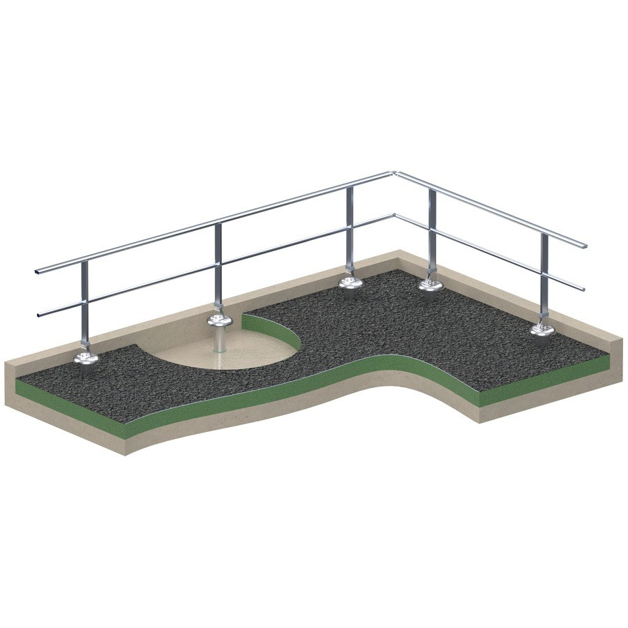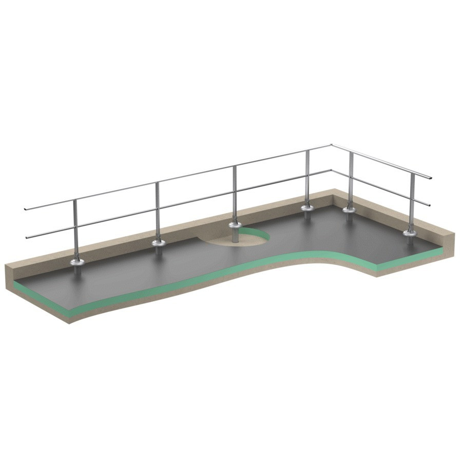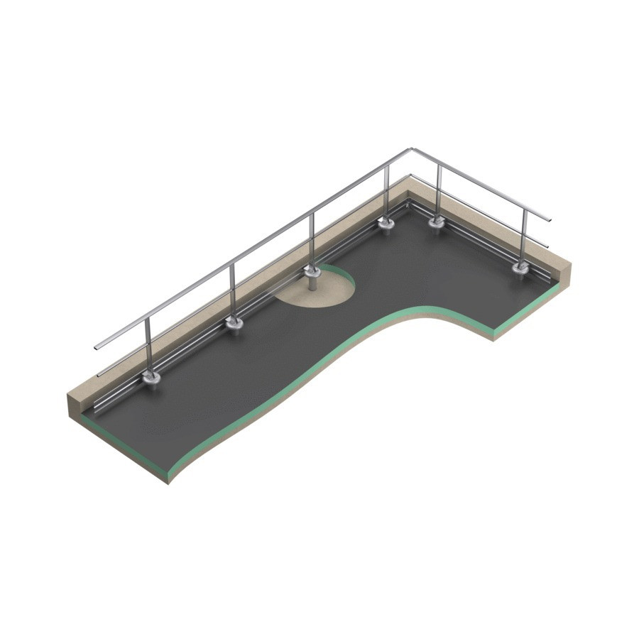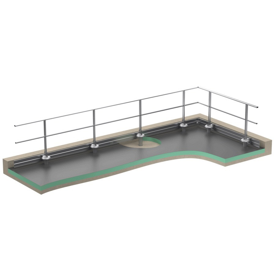 La barandilla FASTGUARD para losas impermeabilizadas se fija sobre losas aisladas atravesando el sistema de impermeabilización mediante su base con zapata D.