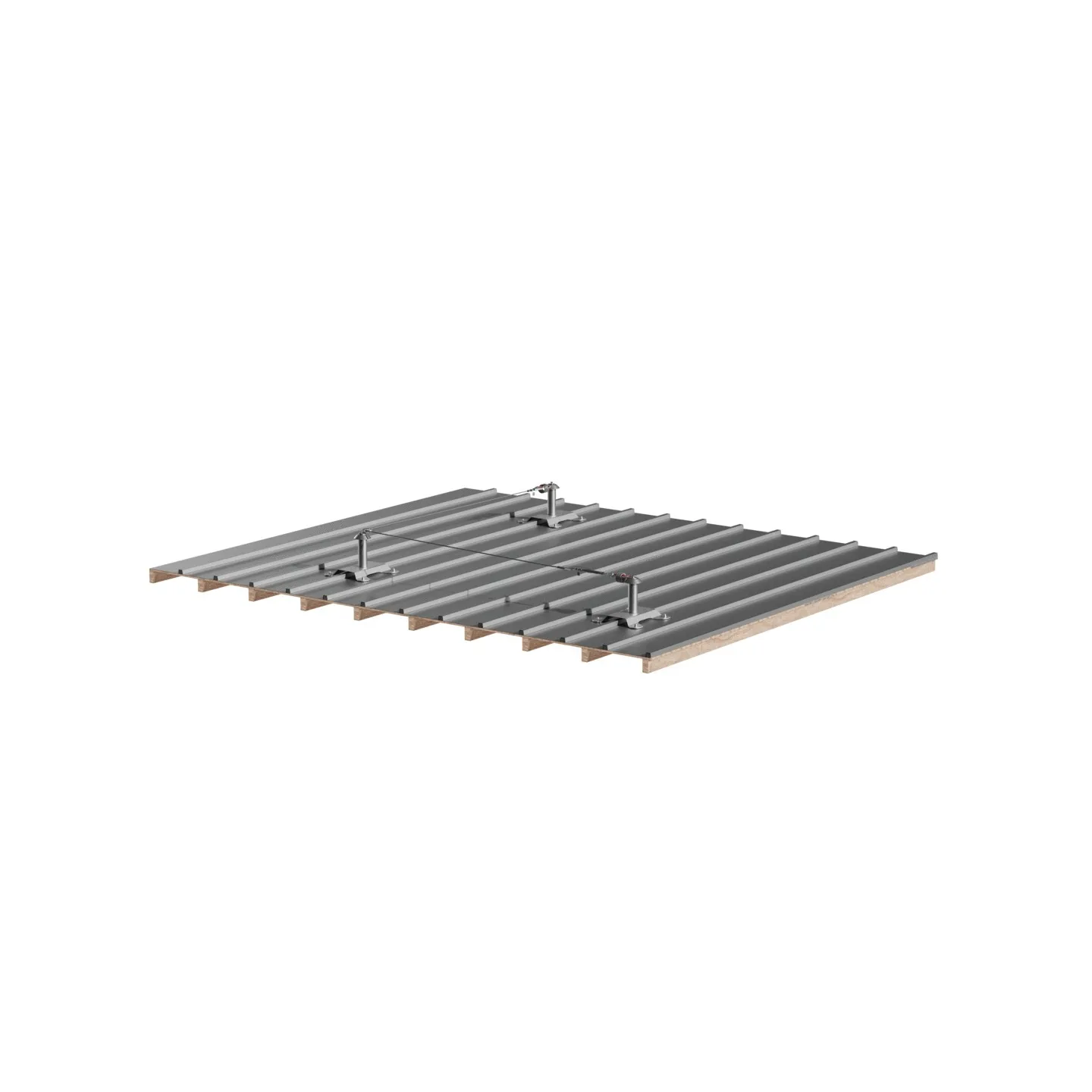 La instalación de una línea de vida de cable CONEKT sobre entablado de zinc se realiza mediante la placa ICZ, especialmente diseñada para este tipo de soporte. Es posible añadir una rehausse diábolo AD o poste basculante PB250 si es necesario.