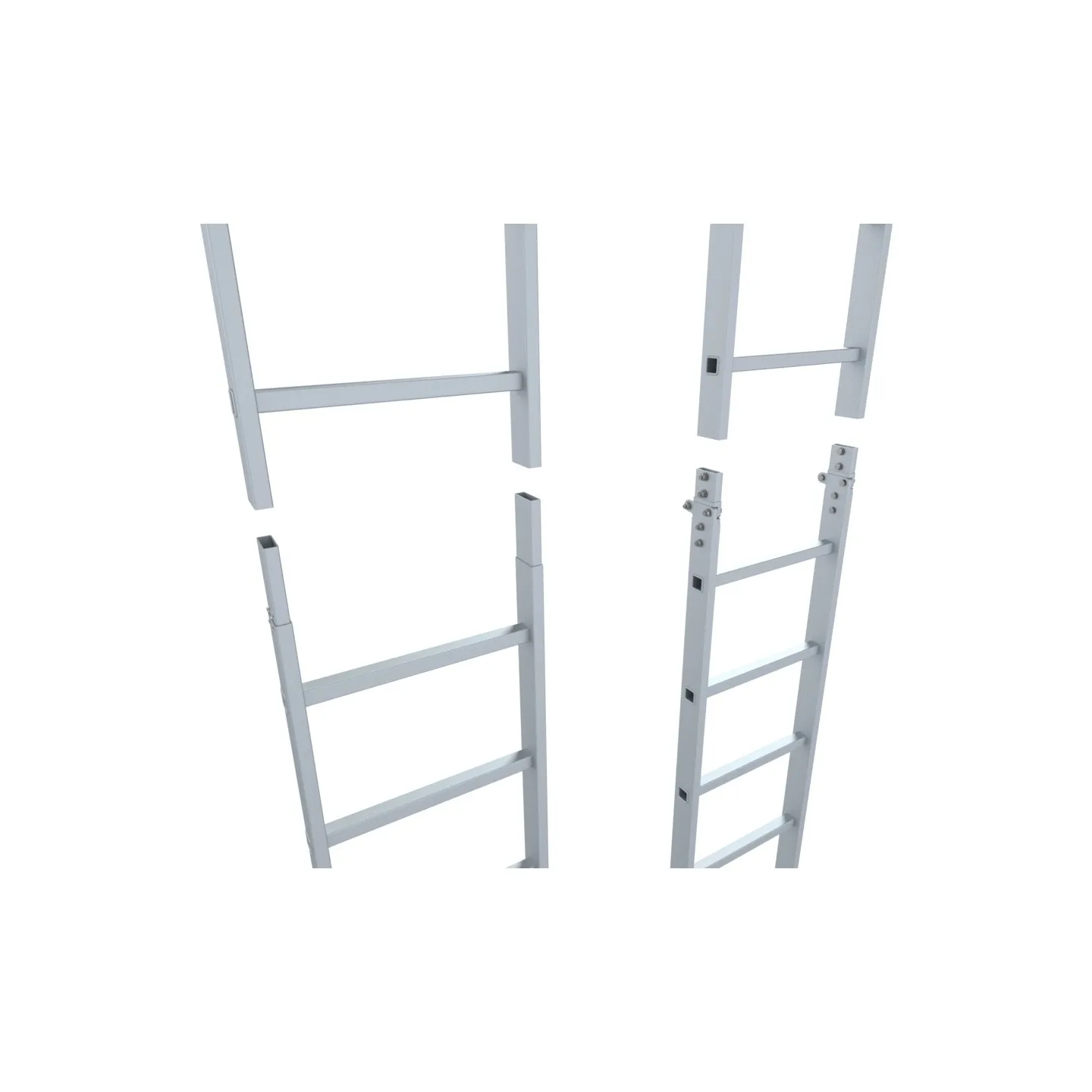 En la versión articulada, las piezas de conexión permiten pre-montar la escalera previa llegada a la obra para reducir tiempos de montaje